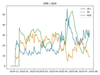 ADX (Average Directional Index) показывает значение 34.66, что указывает на сильный тренд. Значения ADX выше 25 традиционно рассматриваются как признак устойчивого трендового движения, что создает благоприятные условия для трендовых торговых стратегий.